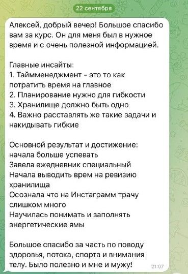 - практика по выявлению и максимальной минимизации пожирателей времени в повседневной жизни.
